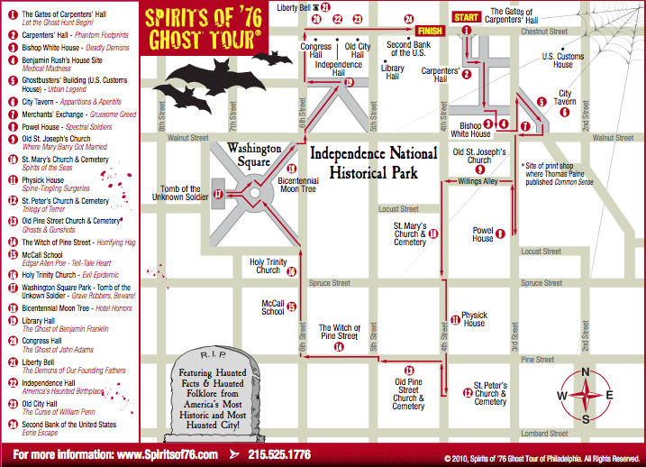 Developed by The Constitutional Walking Tour, Philadelphia's leading walking tour operator, the Spirits of '76 Ghost Tour provides a "High Definition Haunted Experience"™ that features many spooky sites and stories including: